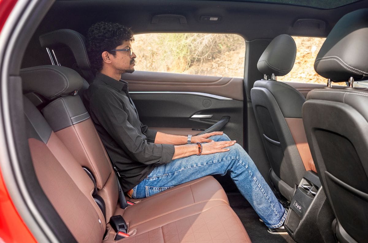 The dual-tone brown and black upholstery with orange stitching lends the cabin a premium look, and so do the vegan leather inserts on the dashboard and door cards, which are soft to the touch. You’ll also find a few bits from the BMW parts bin, like the indicator stalks and door handles. However, some of the plastics in here feel hard and scratchy. Still, on the whole, the cabin impresses with its fit/finish levels, but like the exterior, it lacks the requisite wow factor.