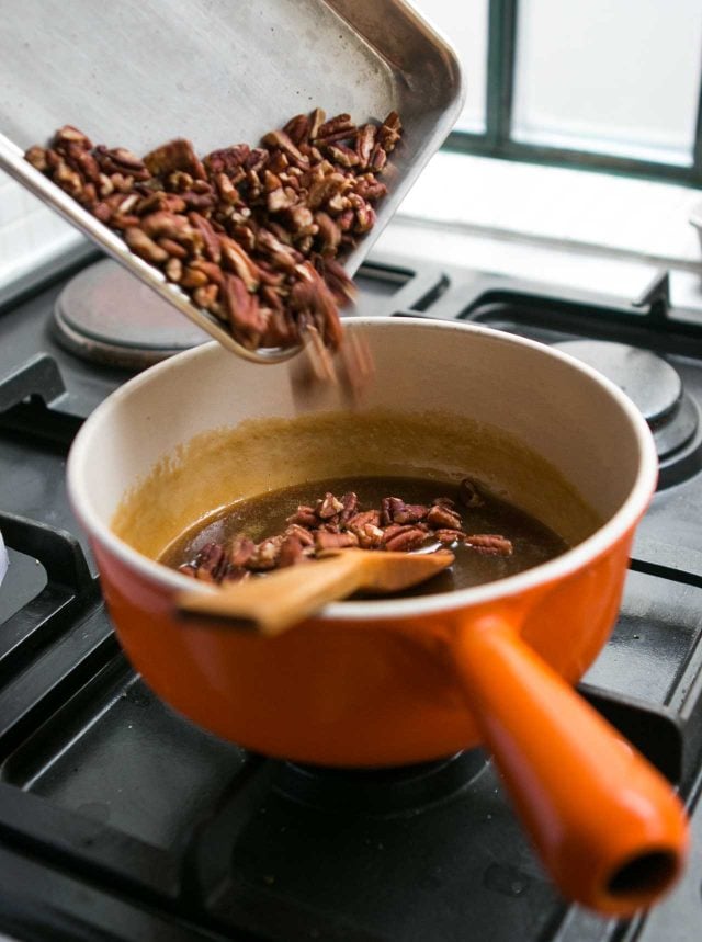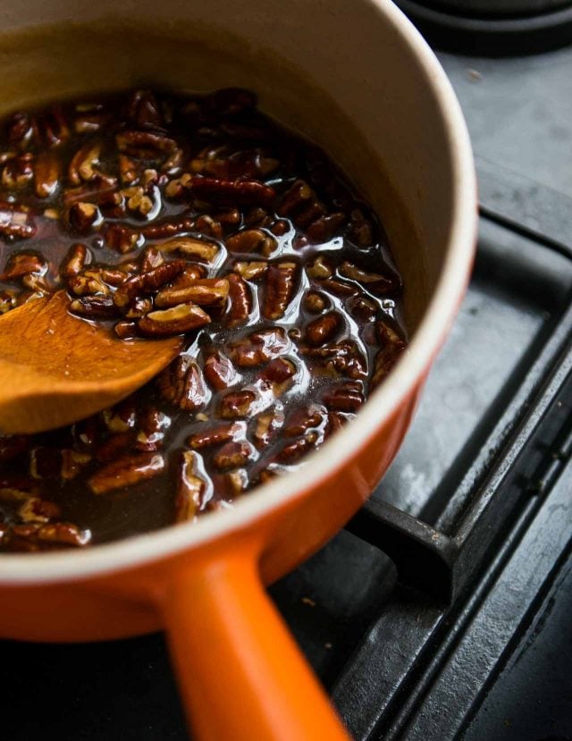In the meantime, I’m standing over my stove, stirring warm, just-toasted pecans into my praline sauce before lacing it with a dash of bourbon.