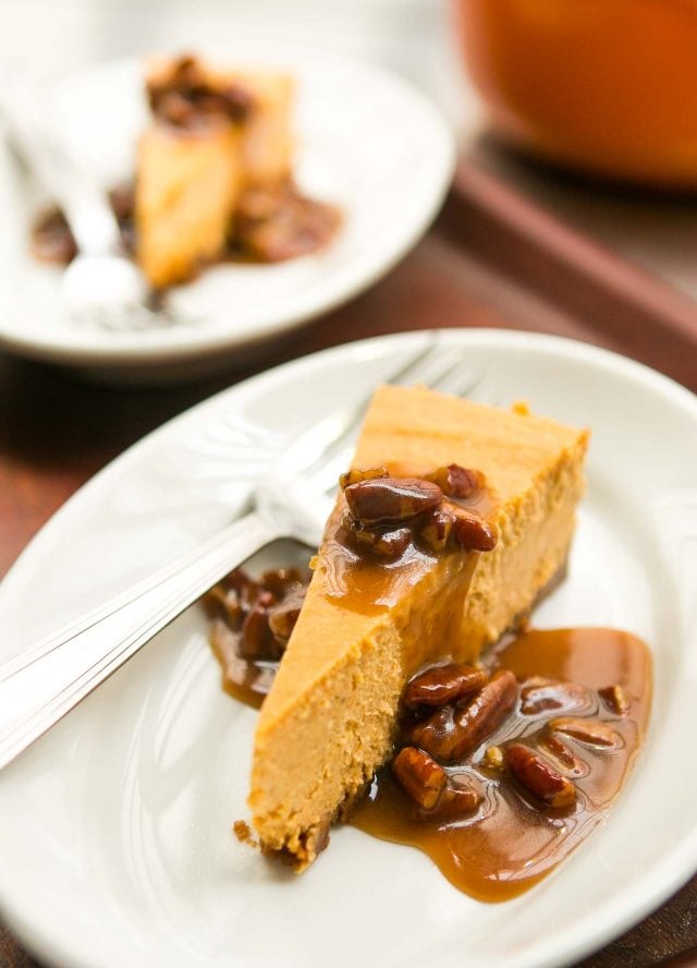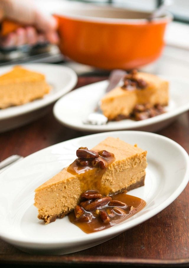 To get that last image out of your mind, I present pumpkin cheesecake with a pecan praline sauce, that has nothing not to like about it. Cream cheese and sour cream, a buttery cookie crust, and a brown sugar and bourbon-tinged sauce loaded with crunchy pecans. I’m in.