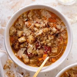 It’s a perfect soup to make ahead of time. I (of course!) add a parmesan rind to the broth while it simmers which delivers incredible, rich flavor. It gives it an extra boost that makes it taste so special and fancy, while being a totally hands-off trick.