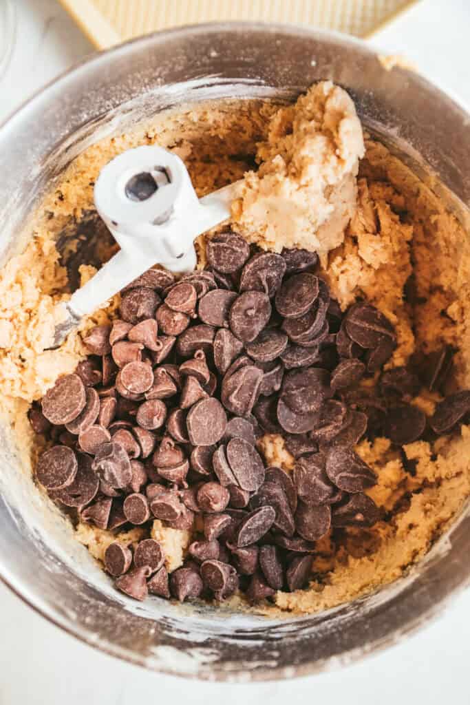 Add the dry ingredients to the butter mixture and mix on low speed until just combined. Toss in the chocolate chips and mix just until the chips are distributed. Try not to overmix.