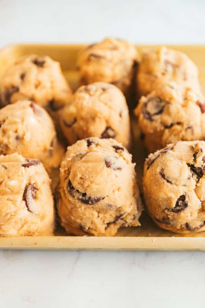 Scoop the dough into tall 5-ounce cookie balls – shape them taller than they are wide. They’ll look comically tall for a cookie, but trust the process. Place the dough balls side-by-side on a small sheet pan, cover with plastic wrap, and freeze overnight.