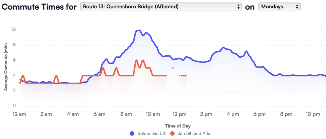 In an effort to reduce traffic, New York launched a program that charges a toll to enter defined areas that are often congested. To see if the program works, Joshua Moshes and Benjamin Moshes, as a student project, made a tracker that logs Google Maps traffic data at checkpoints. Current travel times are compared against average times before the program launch.