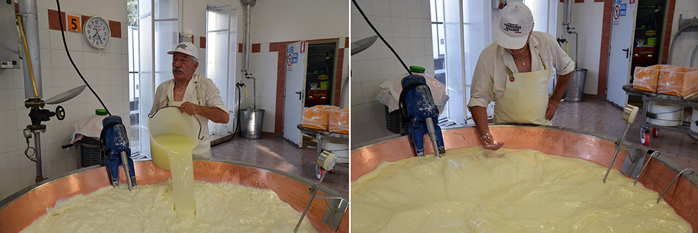 A master cheese-maker at the Istituto Lazzaro Spallanzani, adding whey to local milk and then feeling the curds with his hands as he makes Parmigiano Reggiano. Photos by Nicola Twilley.