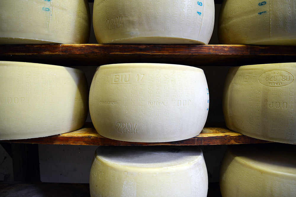 Young rounds of parmesan begin the aging process in a refrigerated cheese cave. Photo by Nicola Twilley.